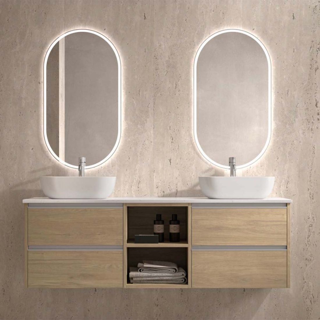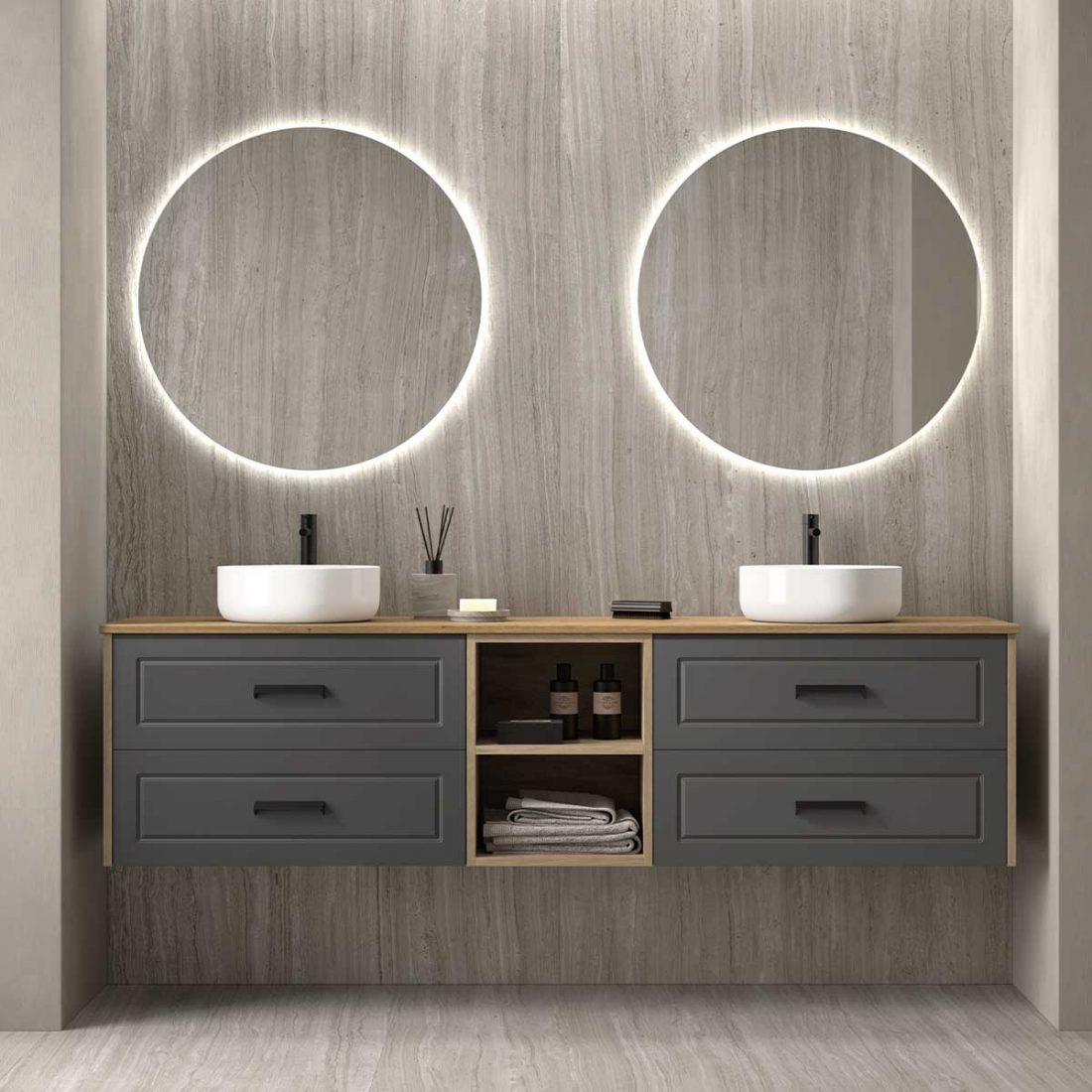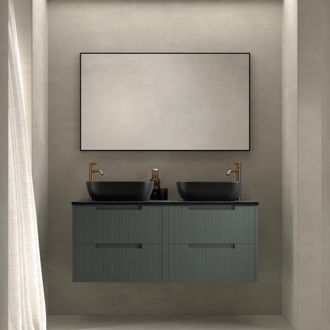 Colección con frontales mecanizados con acanalado vertical y uñero. Está fabricada con estructura de doble casco y terminaciones en Blanco mate, Gris mate y Verde, mate. Además de estos colores, los costados también pueden ser en Negro mate, Denver y